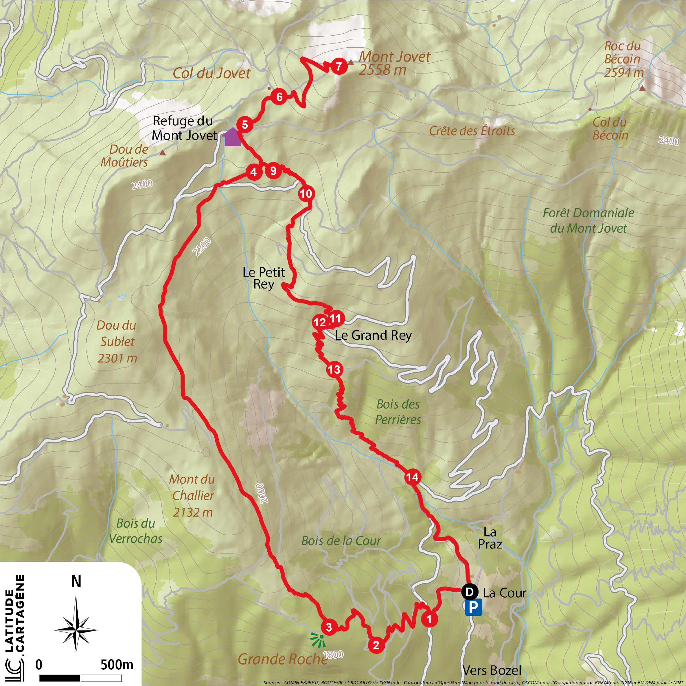 Au rond-point du centre ville, prendre la direction de Villemartin. Continuez la route au-dessus en direction du village d’alpage de la Cour. (Parking à la sortie du hameau de la Cour). Revenir dans le village de la Cour pour prendre le sentier balisé en direction de La Grande Roche et du Mont Jovet