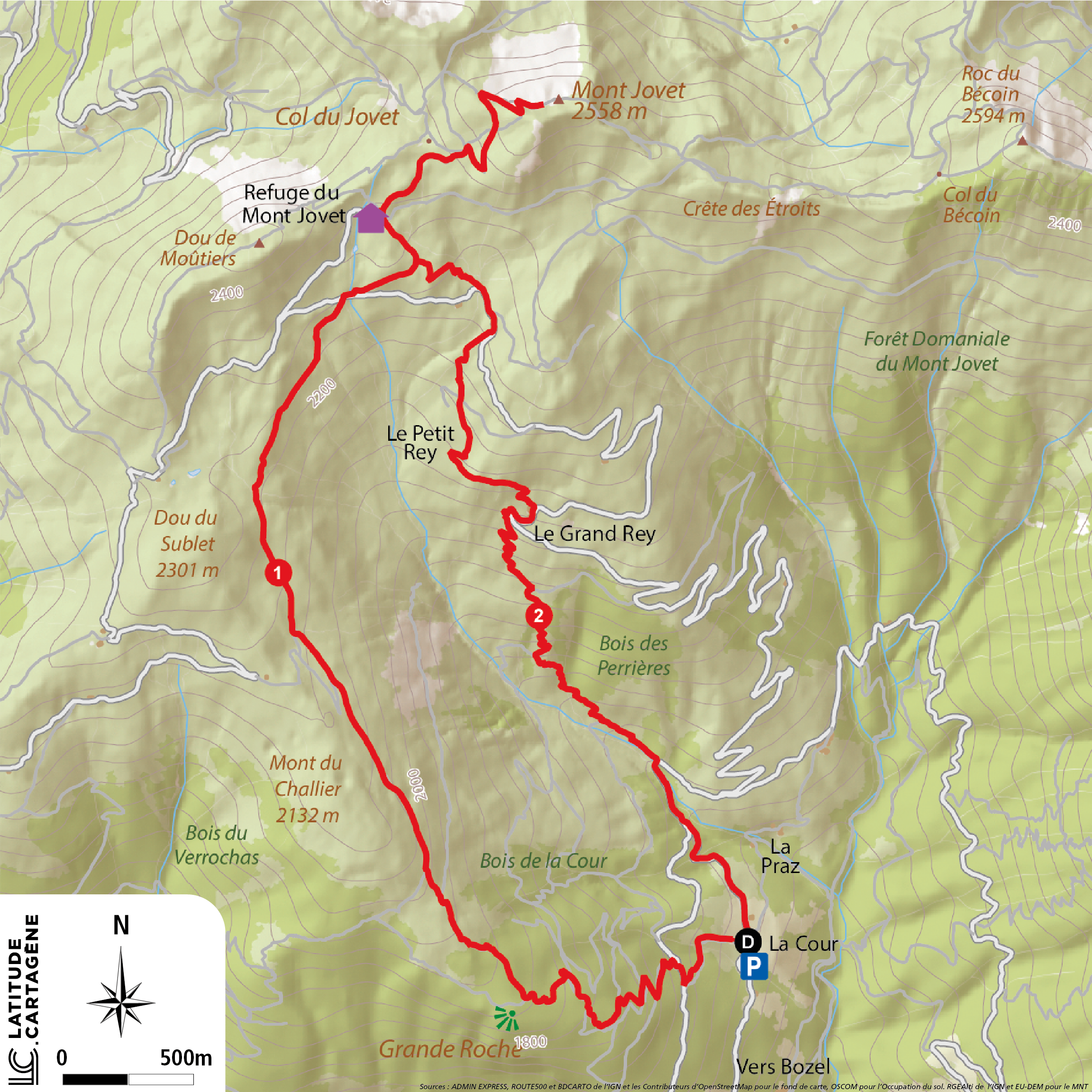 Au rond-point du centre ville, prendre la direction de Villemartin. Continuez la route au-dessus en direction du village d’alpage de la Cour. (Parking à la sortie du hameau de la Cour). Revenir dans le village de la Cour pour prendre le sentier balisé en direction de La Grande Roche et du Mont Jovet